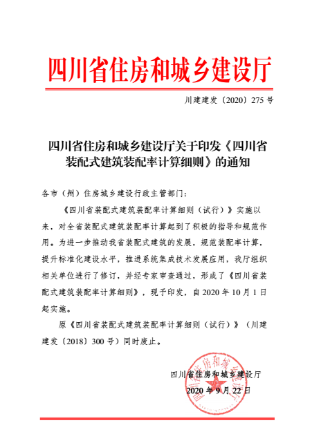 原《四川省裝配式建筑裝配率計算細則(試行)》(川建建發〔 2018〕 300 號)同時廢止。