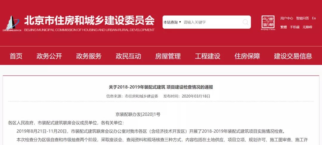 2020年3月18日,北京市發(fā)展裝配式建筑工作聯(lián)席會(huì)議辦公室《關(guān)于2018-2019年裝配式建筑項(xiàng)目建設(shè)檢查情況的通報(bào)》,內(nèi)容強(qiáng)調(diào):